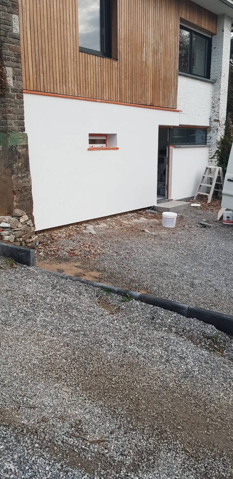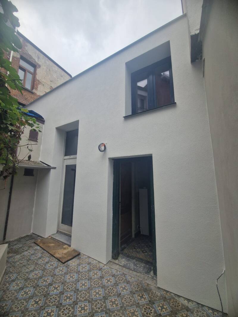 Achtergevel werd geïsoleerd, bepleisterd en afgewerkt in mooi gebroken wit crepi laag.